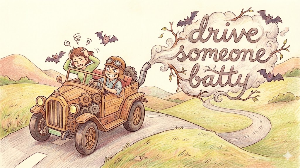 drive someone batty는 머릿속에 박쥐가 날아다니는 것처럼 정신 사납게 하여 '누군가를 미치게 하다(성가시게 하다)' 입니다. ('Batty'는 '미친/괴짜의'라는 뜻)