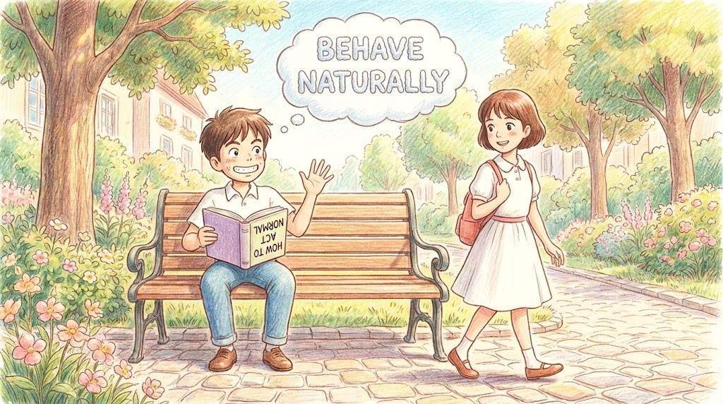 긴장되거나 무언가 숨겨야 하는 상황에서 "티 내지 말고 평소처럼 해(Act normal)" 라고 주문할 때 가장 많이 씁니다. 좋아하는 사람이 지나가거나, 거짓말을 하고 있거나, 경찰 앞을 지나갈 때처럼 부자연스러워지기 쉬운 순간에 필요한 태도입니다.