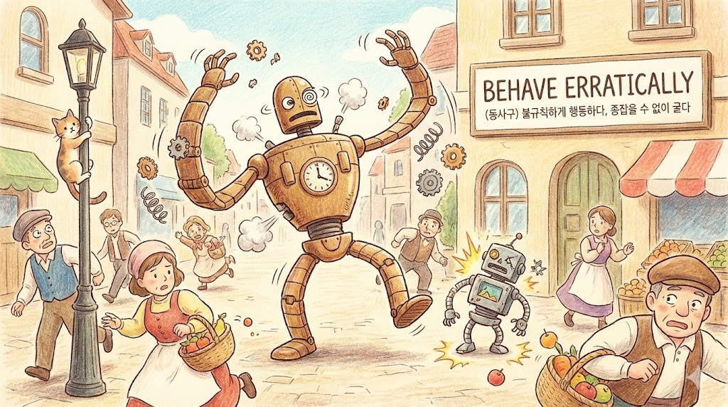 - Erratically: 패턴 없이 제멋대로, '불규칙하게(변덕스럽게/오작동하며)' 움직이는 것.
