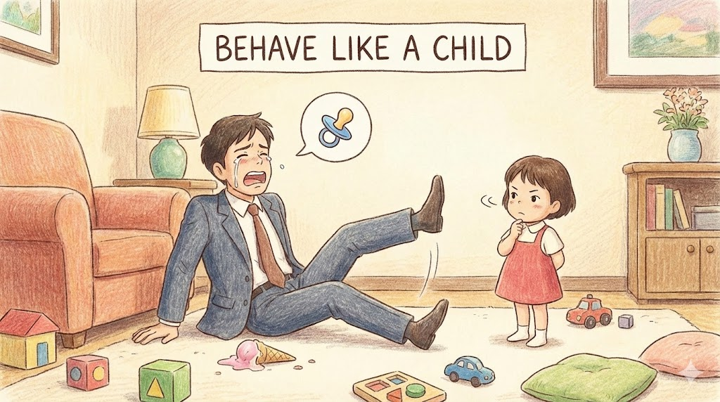 몸은 어른인데 정신 연령이 낮아 보일 때 씁니다. 자기 뜻대로 안 된다고 떼를 쓰거나(Throw a tantrum), 별것도 아닌 일로 토라지고, 책임을 회피하는 등 '성숙하지 못한(Immature) 태도' 를 비판할 때 사용하는 말입니다.