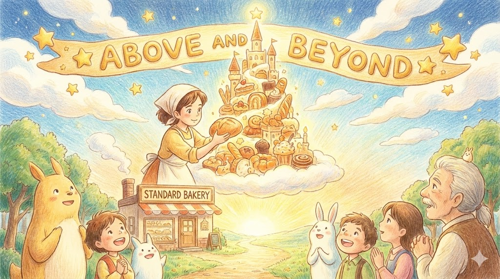 - Above and beyond: 단순히 넘는 것(beyond) 그 위(above)까지 간다는 뜻으로, 맡은 의무보다 '기대 이상으로(훨씬 더 헌신적으로)' 해내는 것을 칭찬할 때 씁니다.
