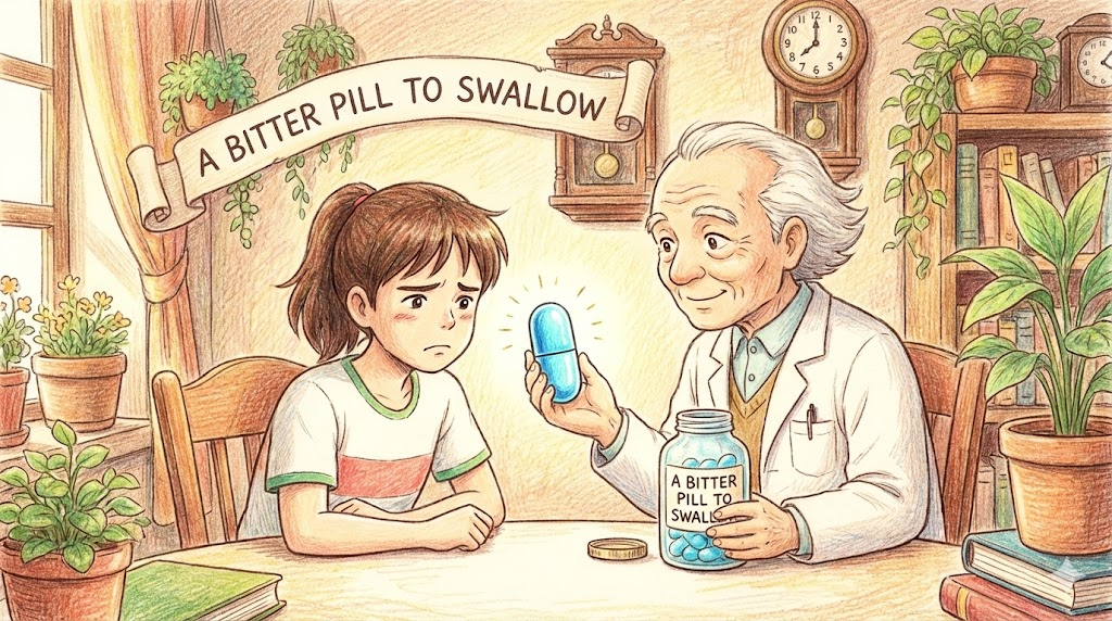 - A bitter pill to swallow. (받아들이기 힘든 현실 / 싫지만 삼켜야 하는 것. - 쓴 약을 억지로 삼키듯)