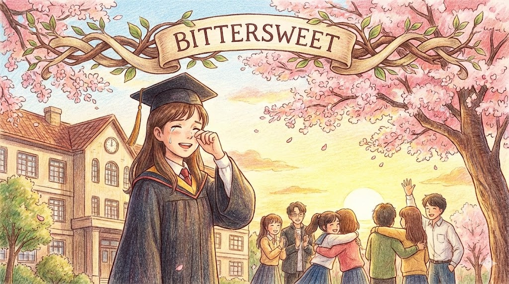 - Bittersweet. (시원섭섭한 / 달콤씁쓸한. - 졸업식처럼 슬프면서도 기쁜 감정, 혹은 다크 초콜릿 맛)