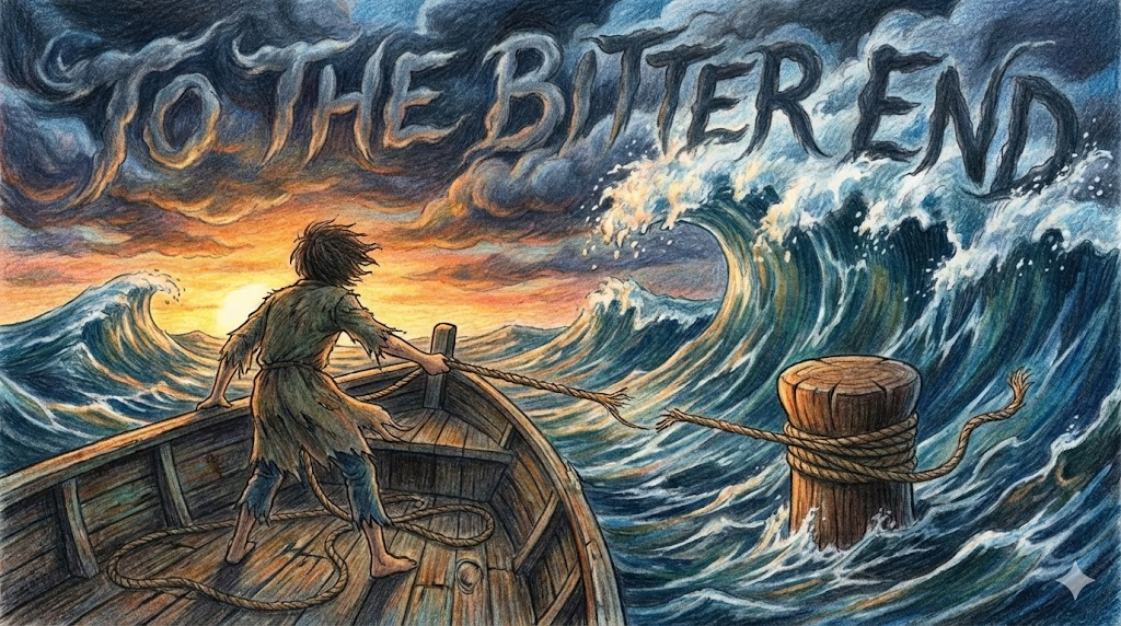결과가 좋지 않을 것을 알면서도, 혹은 과정이 아무리 고통스러워도 '마지막 순간까지 포기하지 않고 계속하는' 것을 말합니다. 배의 닻을 묶는 밧줄의 끝부분(bitt end)까지 다 풀려버린 상황에서 유래했다는 설이 있습니다. 주로 싸움이나 전쟁, 논쟁에서 물러서지 않는 태도를 묘사합니다.