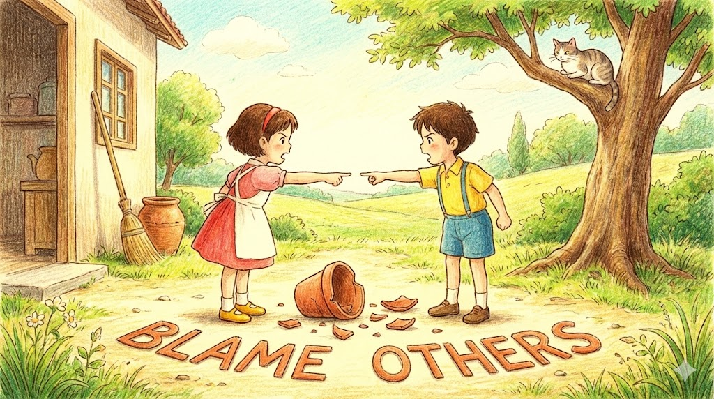 - 해석: 자신의 잘못을 인정하지 않고 다른 사람에게 책임을 떠넘기는 것입니다. (Pass the buck)