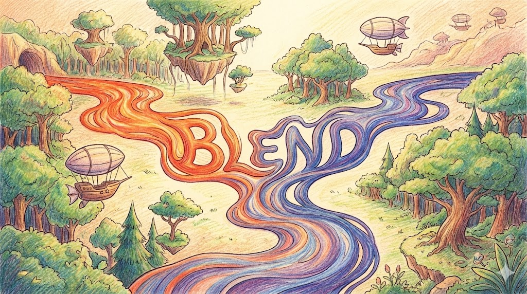 서로 다른 것들을 합쳐서 '경계가 보이지 않게 부드럽게 하나로 만드는(Mix smoothly)' 것입니다. 요리할 때 믹서기(Blender)로 갈아서 재료를 섞거나, 그림 그릴 때 두 가지 색을 문질러서 자연스러운 그라데이션을 만드는 것을 상상하면 됩니다.
