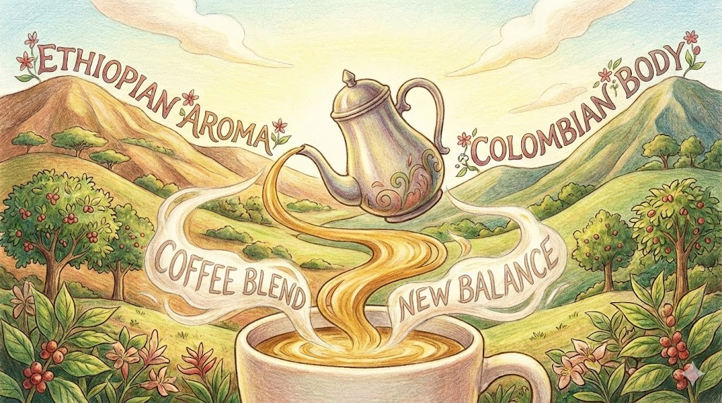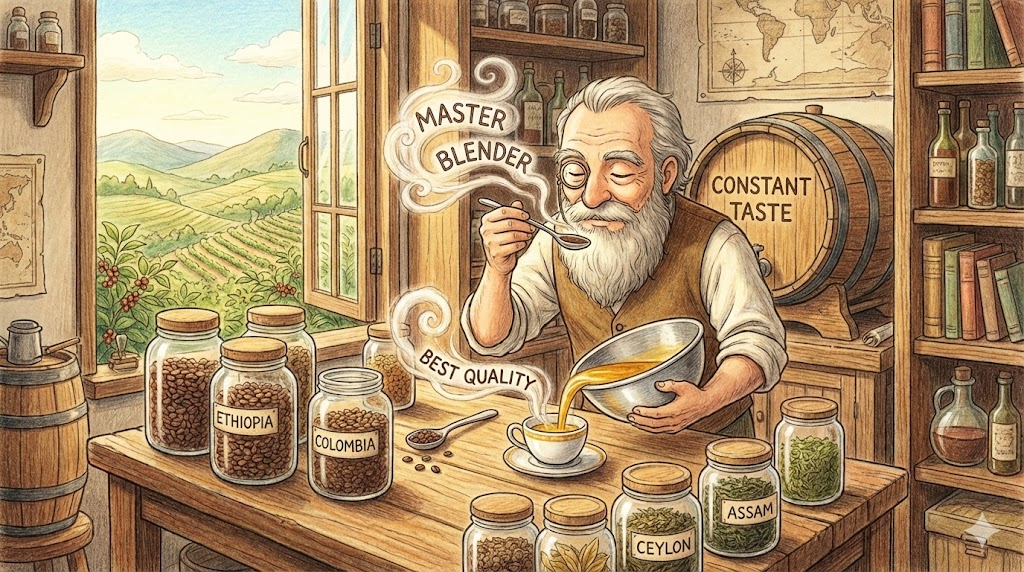 한 지역에서 생산된 원두(Single Origin)만 쓰는 것이 아니라, 에티오피아의 향과 콜롬비아의 바디감 등을 섞어서 '새롭고 균형 잡힌 맛을 창조해 낸 커피' 입니다. 카페마다 자신들만의 고유한 맛을 내기 위해 만드는 'House blend'가 대표적입니다.