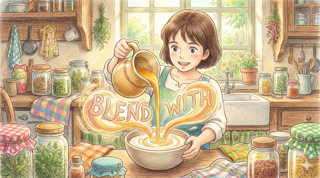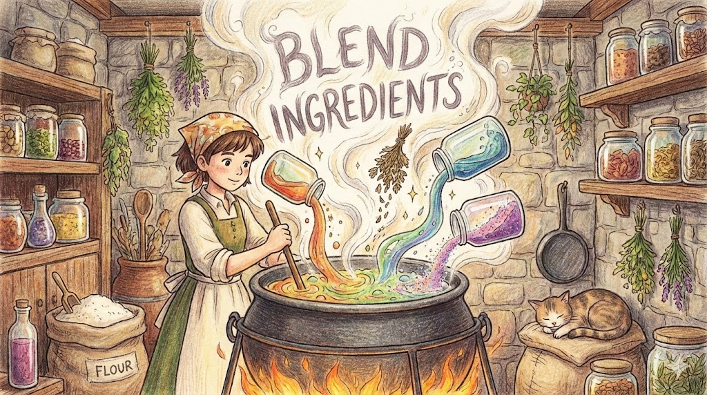 'blend'는 여러 재료를 섞어서 새로운 하나를 만든다는 의미에서 "섞다(혼합하다)" 라는 뜻과, 색이나 소리가 튀지 않고 자연스럽게 "조화되다(어우러지다)" 라는 뜻을 가집니다. 단순히 뒤죽박죽 섞는 'Mix'보다 훨씬 더 부드럽고 경계가 사라지게 섞이는 뉘앙스입니다.