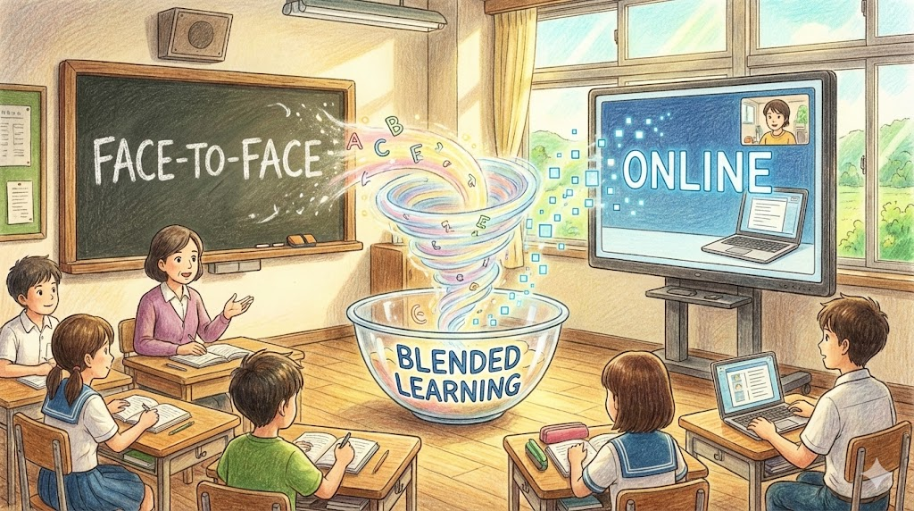교육 현장에서 쓰이는 전문 용어입니다. 전통적인 '교실 수업(Face-to-face)' 과 현대적인 '온라인/디지털 학습(Online)' 을 적절히 섞어서(Blend) 장점만 취하는 학습 방식입니다. 집에서 인터넷 강의를 듣고, 학교에서는 토론을 하는 방식 등이 이에 해당합니다.
