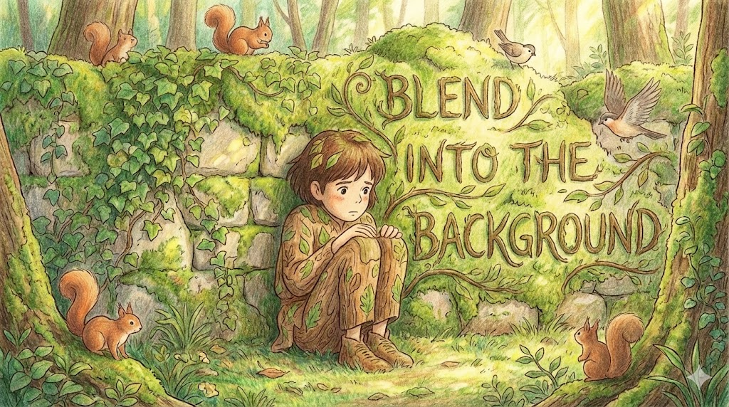 - 해석: 존재감이 드러나지 않게 조용히 있거나, 배경색과 비슷해서 안 보이는 것입니다.