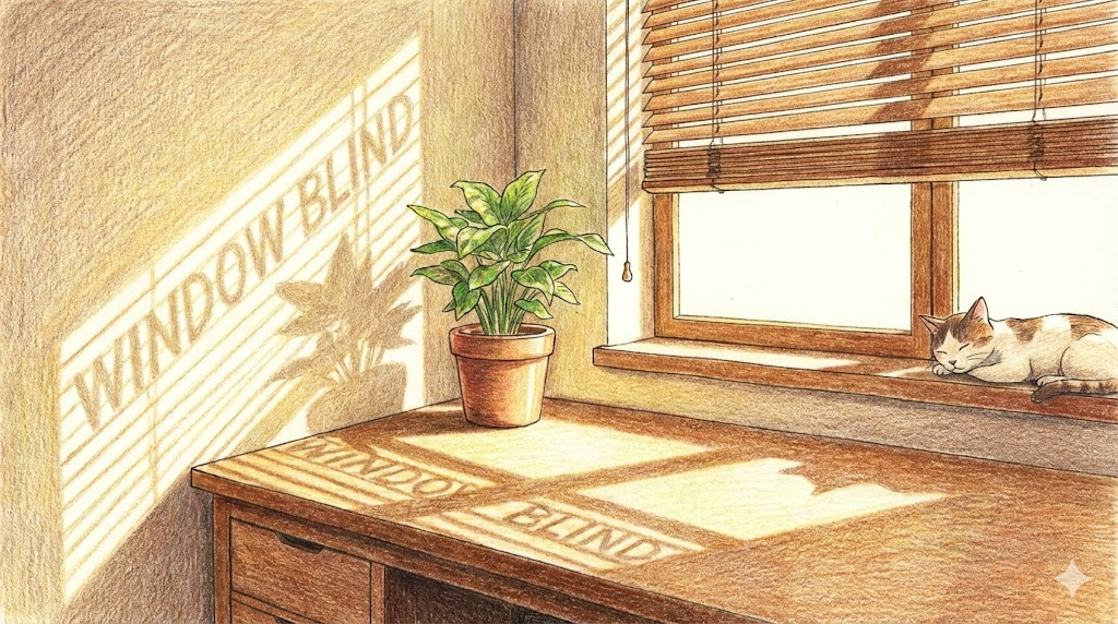 커튼(Curtain)이 천으로 된 것이라면, 블라인드는 여러 개의 날개(Slat)가 있어서 빛의 양을 조절할 수 있는 장치입니다. 보통 복수형인 "Blinds" 라고 부릅니다. 창문을 가려서 밖에서 안을 '보지 못하게(Blind)' 만든다는 뜻에서 왔습니다.