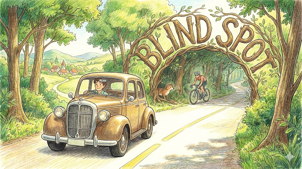 운전할 때 백미러나 사이드미러로 보이지 않는 '죽은 각도(사각)' 를 말합니다. 비유적으로는 내가 너무 잘 안다고 생각해서 방심하거나, 편견 때문에 '객관적으로 보지 못하는 취약한 부분' 을 뜻할 때 아주 많이 씁니다.