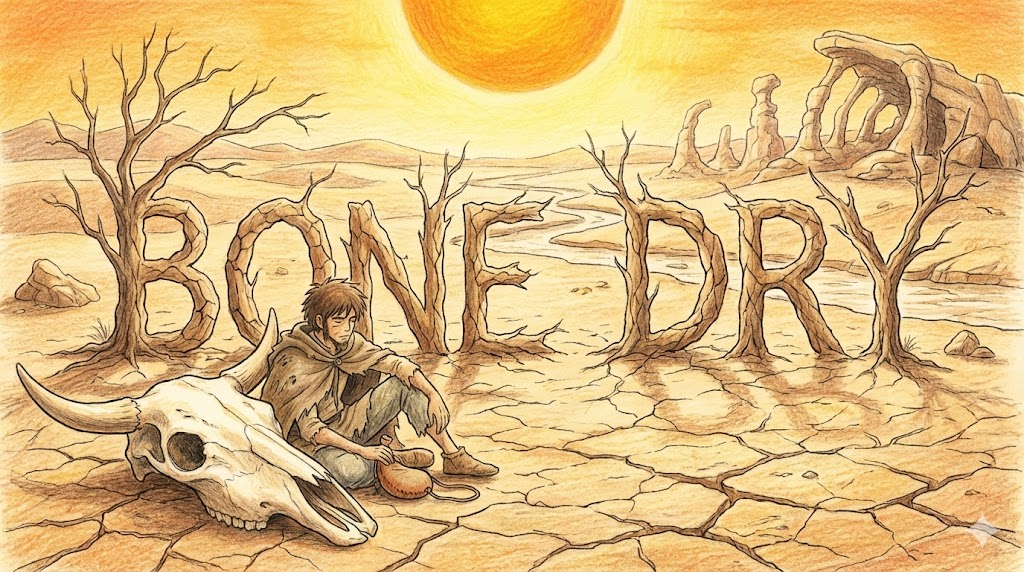 - Bone dry. (바짝 마른. - 햇빛에 하얗게 바랜 뼈처럼 물기가 하나도 없는)