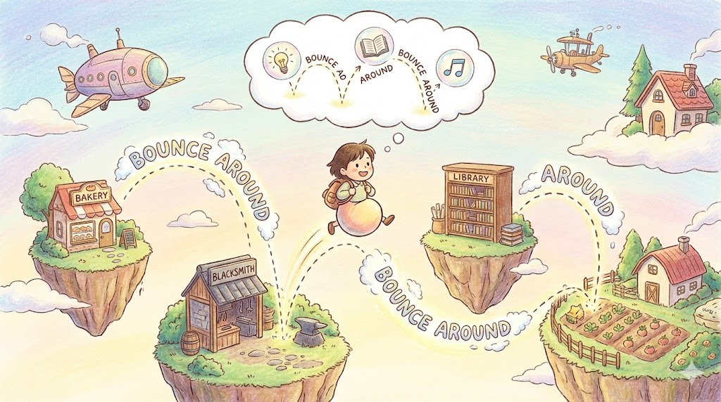 공이 벽에 부딪혀 이리저리 튀어 다니는 것처럼, 한곳에 정착하지 못하고 '이 직장 저 직장 옮겨 다니거나(Float)', 여러 아이디어나 생각이 머릿속에서 '두서없이 떠다니는 상태' 를 말합니다.