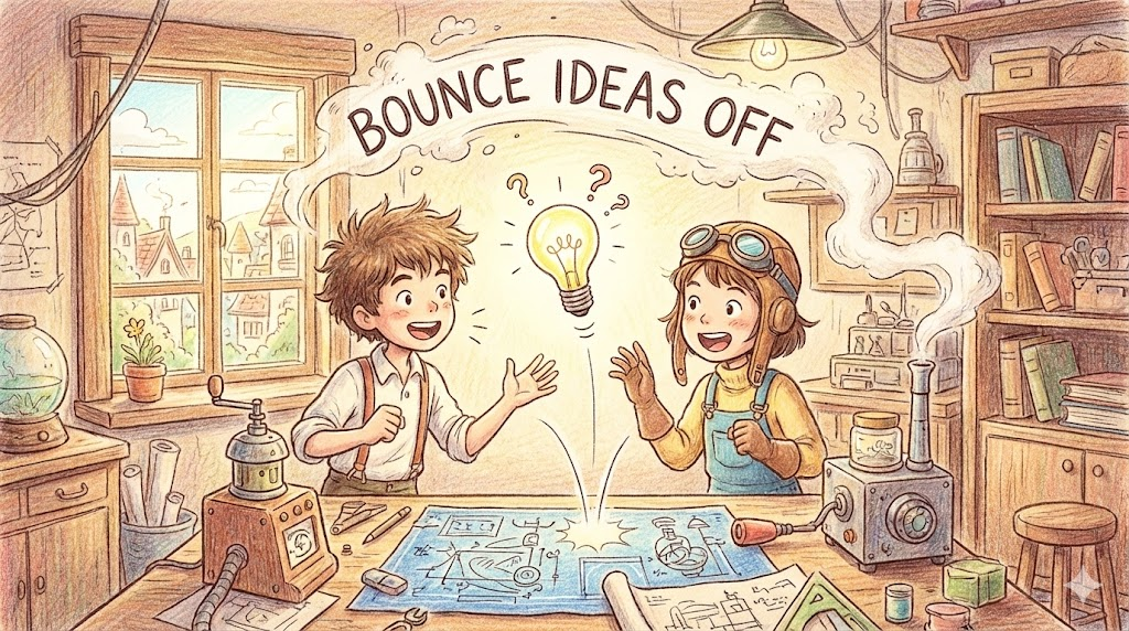 - Bounce ideas off (someone). (~에게 아이디어를 말해보고 반응을 살피다. - 내 생각을 공처럼 던져서 상대방에게 맞고 돌아오는 반응을 보겠다는 뜻)