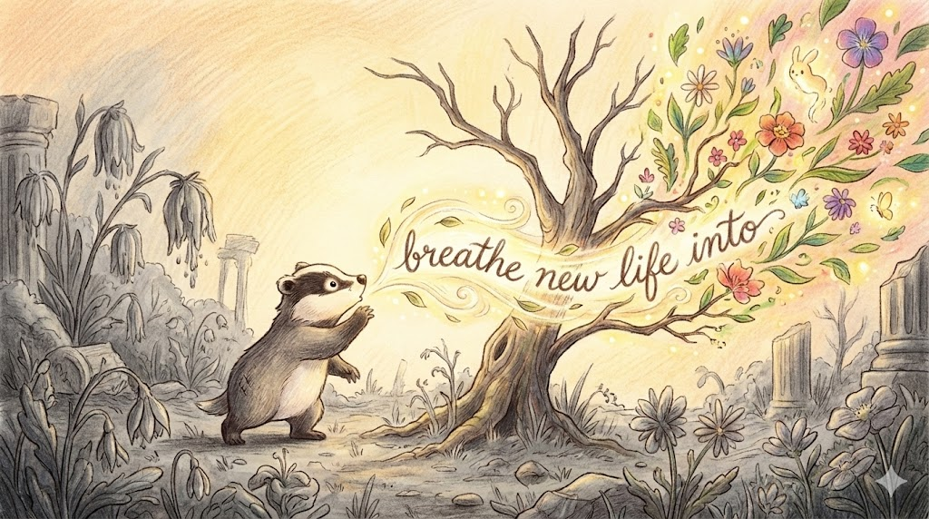 - Breathe new life into: 낡거나 죽어가는 것에 '새 생명(활력)을 불어넣다(심폐소생하다)' 입니다. 오래된 건물 리모델링이나 침체된 프로젝트에 씁니다.