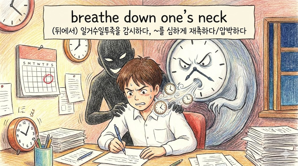 - Breathe down one's neck. (~를 닦달하다 / 감시하다. - 바로 등 뒤에 서서 목에 콧김이 닿을 정도로 가깝게 지켜보는 모습)