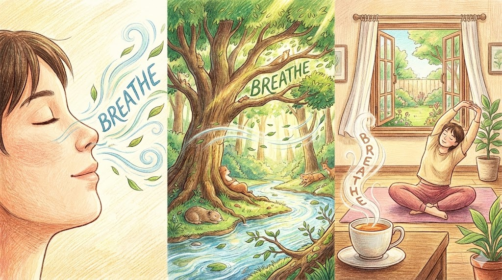 - Breathe in / Breathe out. (숨을 들이마시다 / 내뱉다. - 명상이나 요가 할 때 필수 표현)