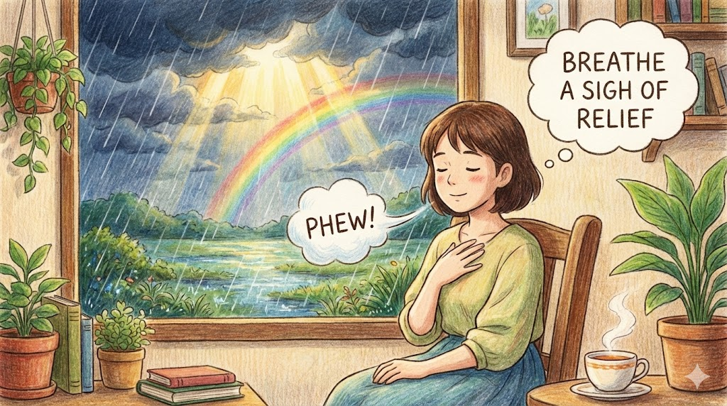 - 해석: 걱정거리가 사라져서 편안하게 숨을 쉬는 상태입니다. (Breathe freely)