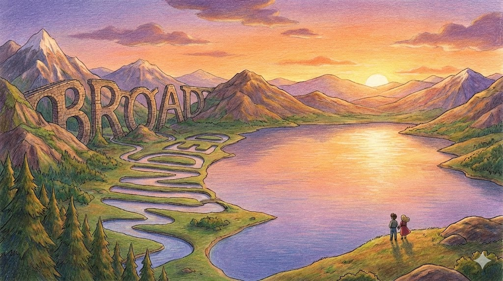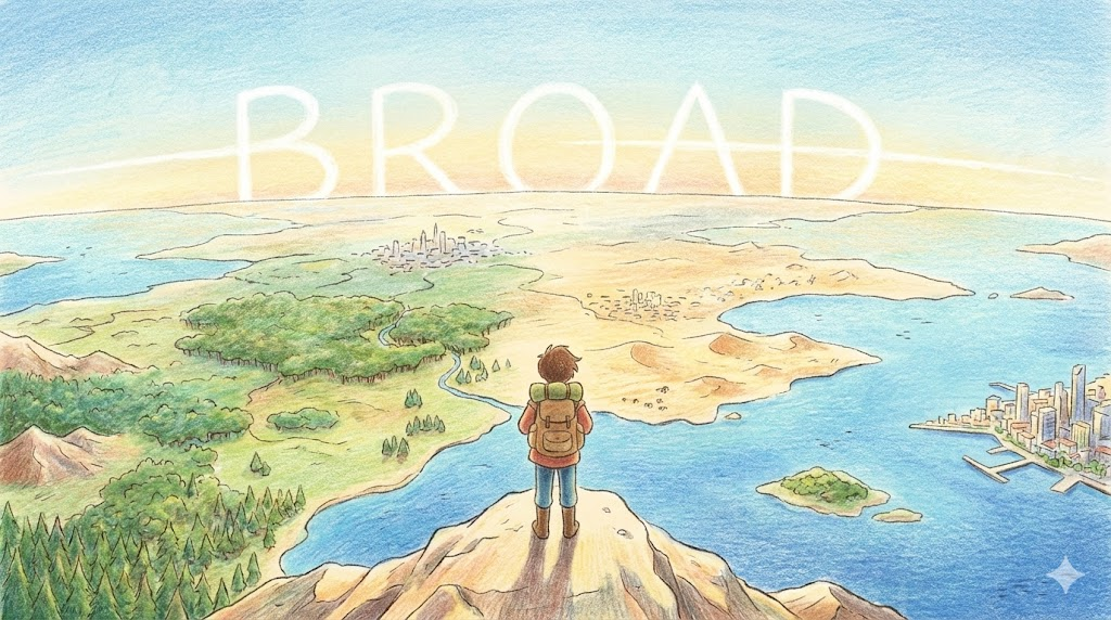 공간의 너비가 넓다는 뜻에서 출발하여, 범위나 지식이 '한쪽에 치우치지 않고 널리 퍼져 있음' 을 나타낼 때 씁니다. "Wide"와 비슷하지만, Wide가 물리적인 '가로 길이'에 집중한다면, Broad는 '탁 트인 느낌이나 추상적인 범위의 방대함' 을 강조할 때 더 자주 쓰입니다.