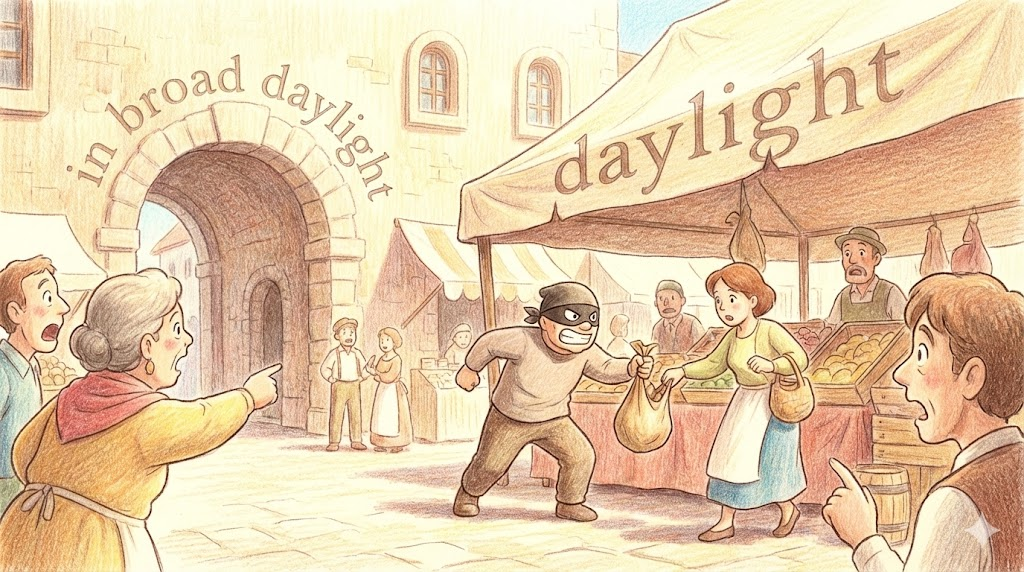 | in broad daylight | 백주 대낮에 | 관용구, '범죄'. | '햇빛' '이' '넓게' '퍼진' '대낮' '에' '대놓고' '행동함'. |