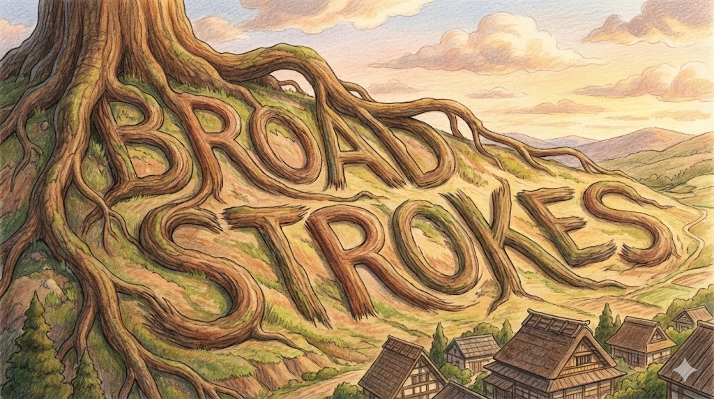 원래는 그림을 그릴 때 붓을 '굵고 시원시원하게 칠하는 기법' 을 말합니다. 비유적으로는 어떤 사건이나 상황을 설명할 때, 미주알고주알 따지지 않고 '핵심적인 특징만 잡아서 큼직큼직하게 묘사하는 방식' 을 뜻합니다. "Paint in broad strokes" 형태로 자주 쓰입니다.