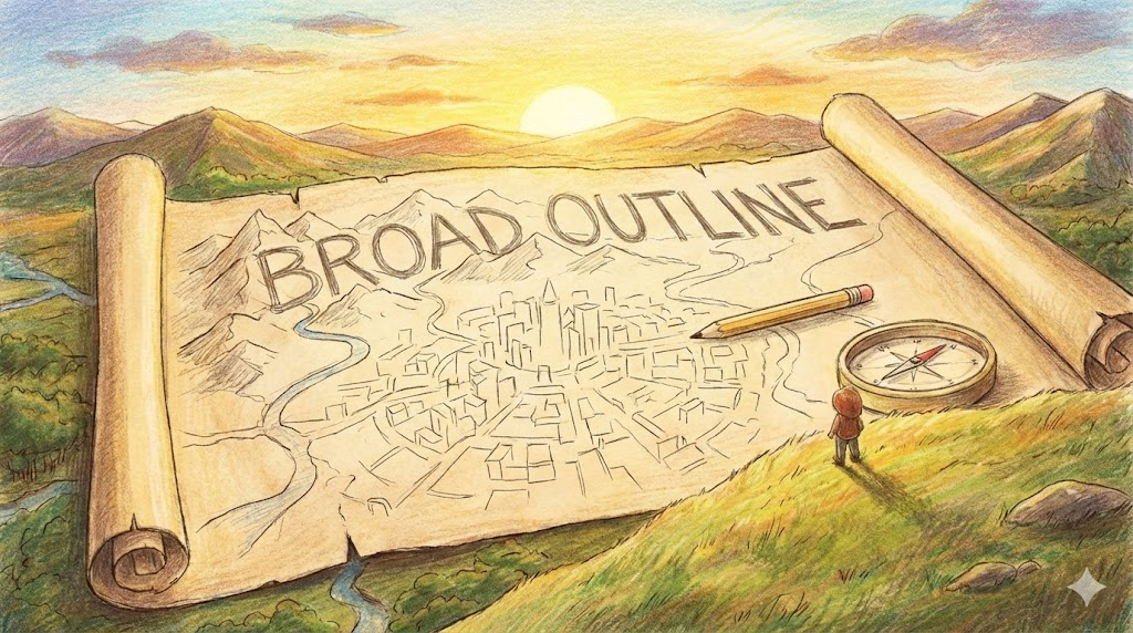 - Broad outline: 세세한 건 빼고 전체 윤곽만 잡은 '대략적인 개요' 입니다.