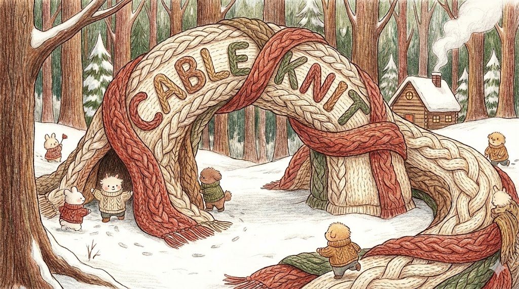 스웨터나 목도리를 짤 때, 털실이 굵은 밧줄(Cable)처럼 꼬이고 얽힌 모양(Twisted rope pattern)으로 짠 것을 말합니다. 한국어로는 흔히 '꽈배기 니트' 라고 부릅니다. 두툼하고 따뜻하며 클래식한 겨울 패션의 대명사입니다.