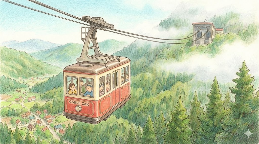 - 해석: 공중에 설치된 케이블에 매달려 이동하는 운송 수단입니다. 샌프란시스코의 전차 같은 지상 케이블카도 포함합니다.