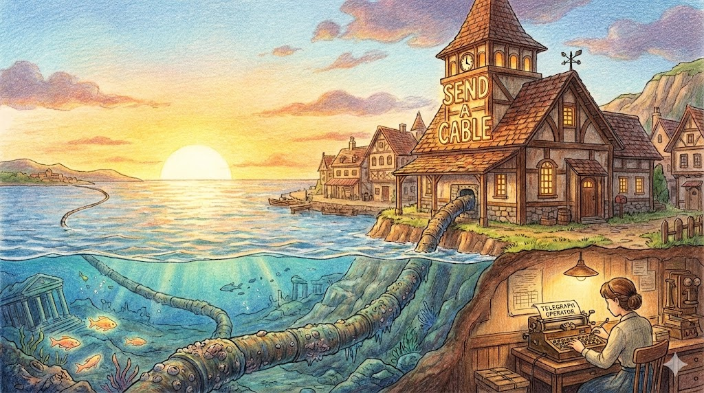 - 해석: (시대극/문학 지문) 20세기 초중반 배경의 글에서 'cable'이 동사로 쓰이거나 'send'와 함께 쓰이면 "해저 전신(전보)을 보내다" 라는 뜻입니다.