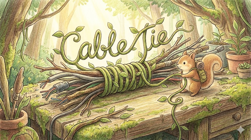 지저분한 전선들을 하나로 묶어 정리할 때 쓰는 튼튼한 플라스틱 끈입니다. 한 번 조이면 풀리지 않고 잘라내야 하는 것이 특징입니다. 전선 정리뿐만 아니라 무언가를 단단히 고정할 때 만능으로 쓰입니다. 일상회화에서는 "Zip tie" 라는 표현을 훨씬 더 많이 씁니다 (조일 때 '지이익(Zip)' 소리가 나기 때문).