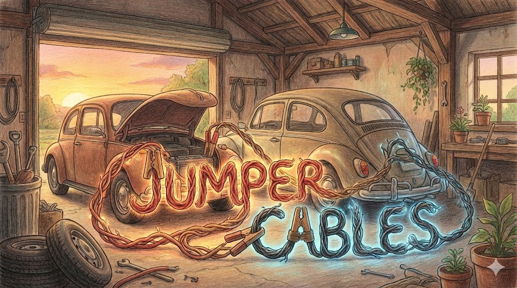 - Jumper cables. ((배터리 충전용) 점프 케이블. - 방전된 차와 다른 차를 연결하는 굵은 집게 전선)