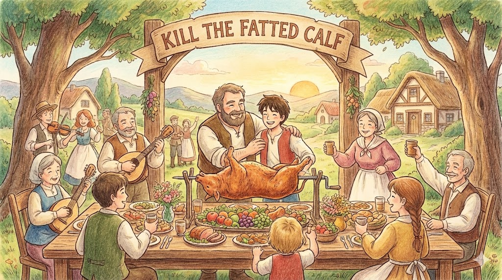 성경의 '돌아온 탕자(Prodigal Son)' 이야기에서 유래한 표현입니다. 아버지가 집을 나갔다 돌아온 아들을 위해 가장 아끼던 살진 송아지를 잡아 잔치를 벌였다는 내용에서, 오랫동안 못 본 가족이나 손님을 위해 '음식을 풍성하게 차리고 성대하게 대접하는 행위' 를 뜻합니다.