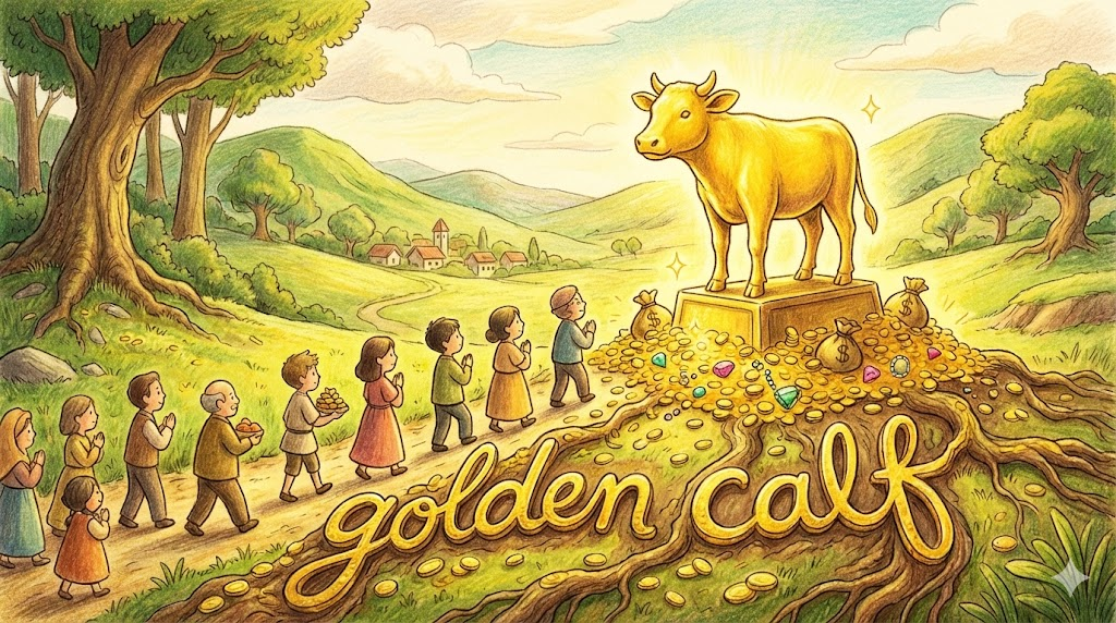 모세가 십계명을 받으러 간 사이 이스라엘 백성들이 만들어 섬겼던 '금송아지' 우상에서 유래했습니다. 현대 영어에서는 정신적인 가치보다 '돈이나 재물, 부(Wealth)를 맹목적으로 숭배하는 대상' 을 비판적으로 일컬을 때 씁니다.