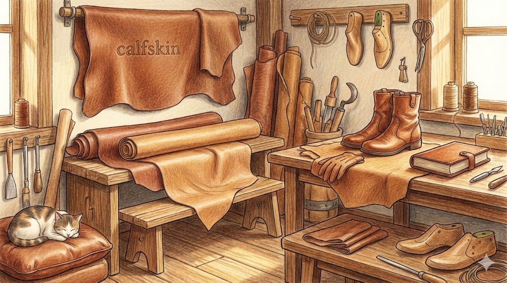 다 자란 소가죽(Cowhide)보다 훨씬 '부드럽고, 결이 고우며, 얇은 고급 가죽' 입니다. 주로 명품 구두, 장갑, 고급 제본(Bookbinding) 등에 사용됩니다.