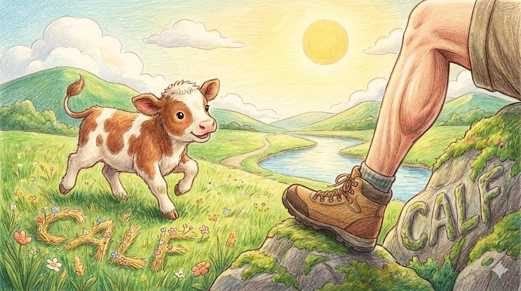 'calf'는 영어 학습자에게 재미있는 다의어입니다. 첫 번째는 소, 고래, 코끼리 등의 "새끼(송아지)" 를 뜻하고, 두 번째는 사람의 다리 뒤쪽 부분인 "종아리" 를 뜻합니다. 복수형은 'calves' 로 변한다는 점이 문법적으로 중요합니다.