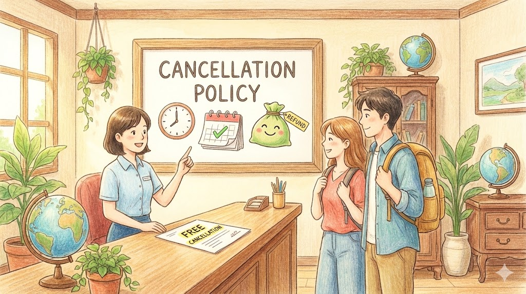 호텔, 항공권, 예약 상품 등을 구매할 때, 예약을 취소할 경우 '돈을 얼마나 돌려받을 수 있는지, 언제까지 취소해야 수수료가 없는지' 등을 명시해 놓은 규칙입니다. 예약 전에 "꼭 확인해 봐야(Check)" 하는 필수 사항입니다.