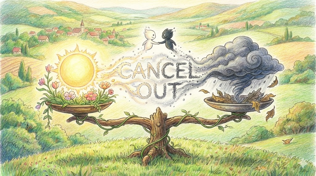 플러스 1과 마이너스 1이 만나면 '0'이 되는 것처럼, 서로 반대되는 두 가지 힘이나 작용이 만나 '결과적으로 아무런 효과가 없게 만드는 것' 을 뜻합니다. 긍정적인 것과 부정적인 것이 섞여서 결국 "쌤쌤(Same same)"이 되거나 원점으로 돌아가는 상황을 묘사할 때 씁니다.