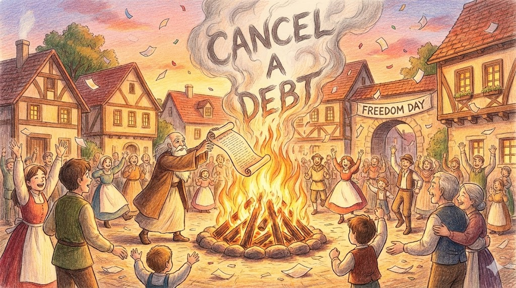 돈을 빌려준 사람(채권자)이 빌린 사람(채무자)에게 "돈을 갚지 않아도 된다" 라고 선언하여 빚을 면제해 주는 것입니다. 돈을 갚아서 빚이 사라지는 것(Pay off)이 아니라, 받을 권리를 포기해서 빚을 '삭제해 주는' 자비로운 행위나 정책적인 결정을 의미합니다. "Forgive a debt"라고도 합니다.