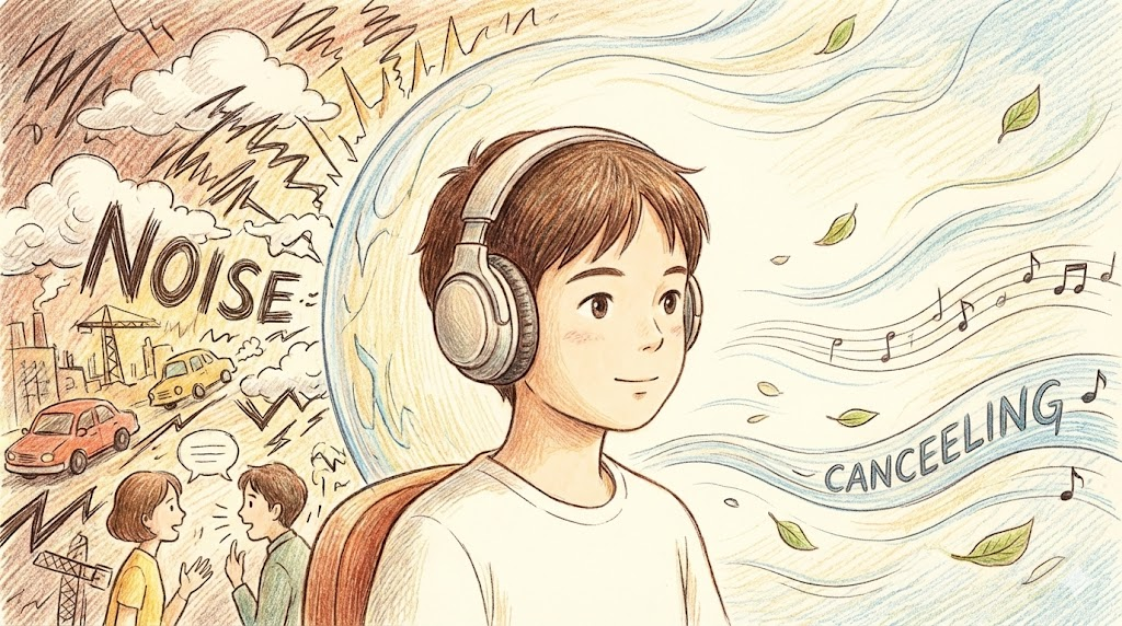 주로 헤드폰이나 이어폰, 마이크 등에 쓰이는 기술 용어입니다. 외부의 시끄러운 소리 파동과 반대되는 파동을 내보내어 소음을 '능동적으로 지워버리는(Active Noise Cancellation)' 기능을 말합니다. 단순히 귀를 막아서 소리를 줄이는 것(Sound isolating)과는 다르게, 기술적으로 소음을 '없애는' 것입니다.