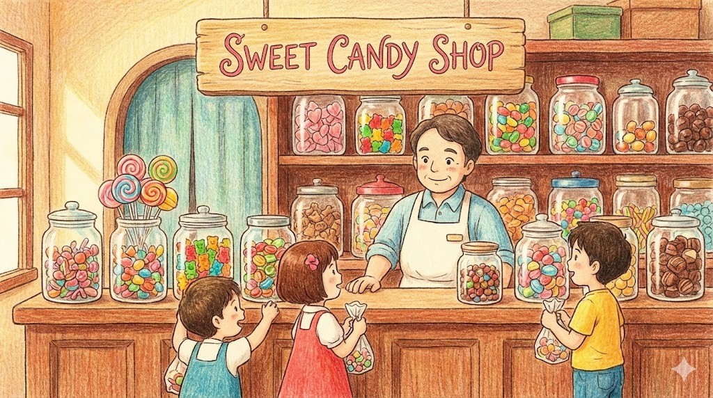 문화 팁: 미국에서는 Candy가 사탕, 초콜릿, 젤리를 다 포함하지만, 영국에서는 Sweets라고 부릅니다. 영국에서 Candy는 주로 '솜사탕(Candy floss)'이나 '줄무늬 사탕' 같은 특정 종류만 뜻합니다.