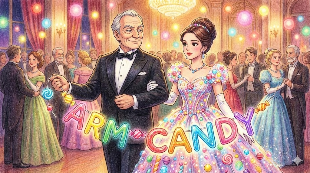 사교 파티나 모임 등에 갈 때, 자신의 사회적 지위나 능력을 과시하기 위해 데리고 가는 '외모가 아주 뛰어난 파트너' 를 비꼬거나 속되게 이르는 말입니다. 팔짱(Arm)을 끼고 다니는 예쁜 장식품(Candy) 취급을 한다는 뉘앙스가 있습니다.