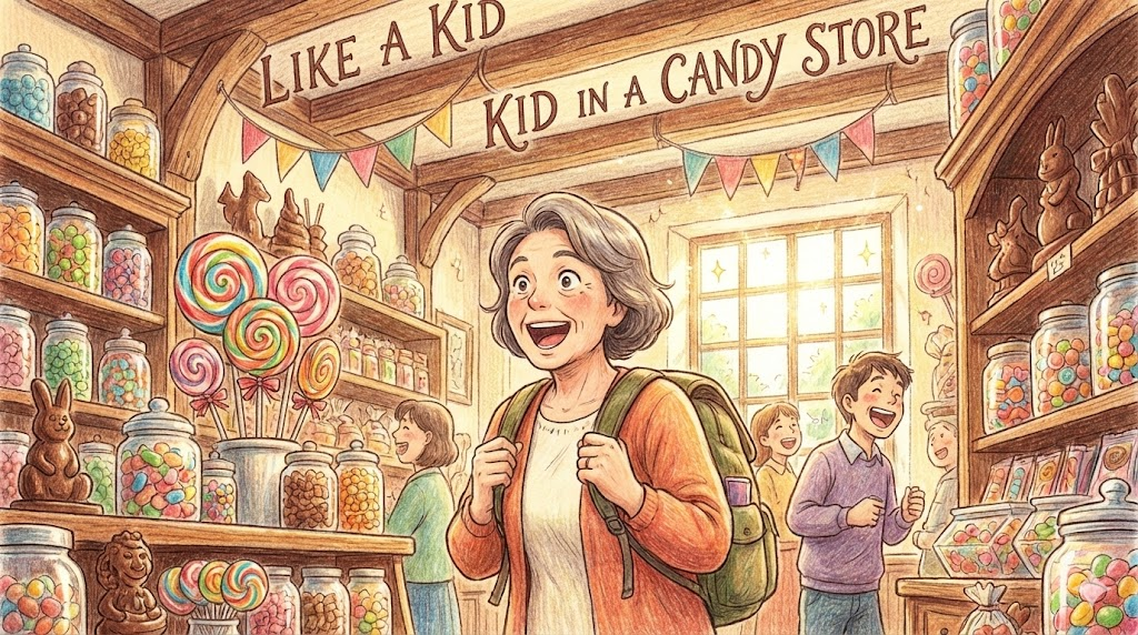- Like a kid in a candy store: 사탕 가게에 들어간 아이처럼, 너무 좋아서 어쩔 줄 모르고 '눈이 휘둥그레진(매우 신난/흥분한)' 상태입니다. 선택지가 너무 많아 압도된 행복감을 표현합니다.