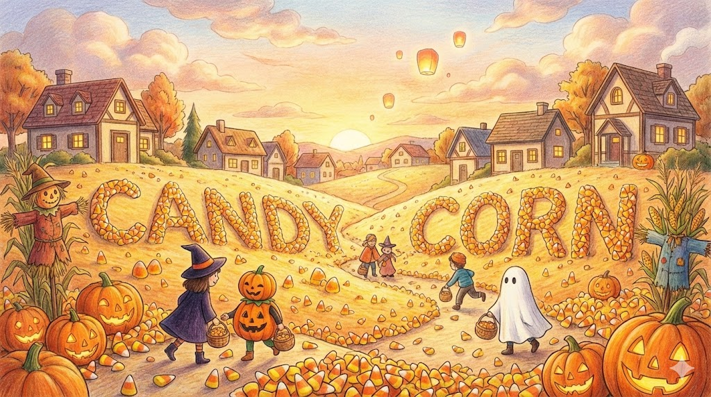 - 해석: (미국 문화) 할로윈(Halloween) 시즌에 먹는, 노란색, 주황색, 흰색이 섞인 삼각뿔 모양의 옥수수 알갱이처럼 생긴 사탕입니다.