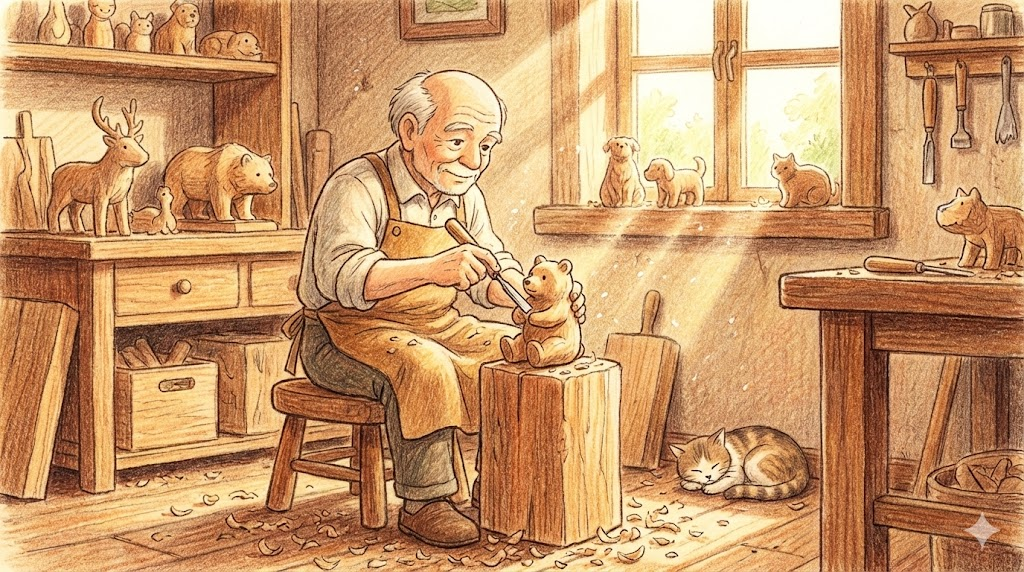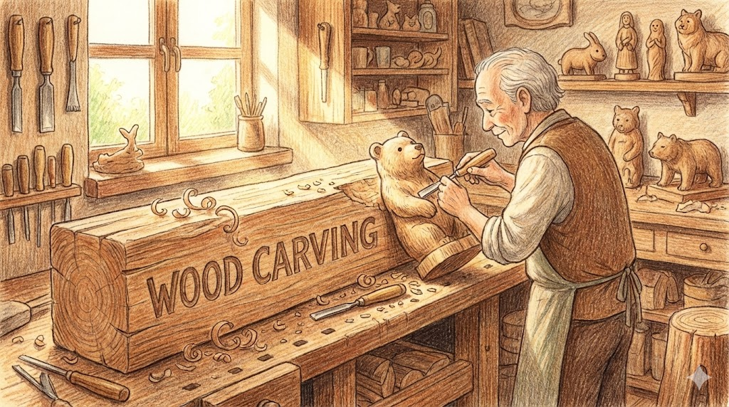 나무를 깎아서(Carve) 예술 작품이나 장식품, 혹은 생활용품을 만드는 '기술이나 행위' 를 뜻하기도 하고, 그렇게 만들어진 '조각품 자체' 를 부르는 말이기도 합니다. 톱이나 기계보다는 조각도(Chisel)나 칼을 사용하여 섬세하게 다듬는 '장인 정신(Craftsmanship)'과 따뜻한 느낌을 줍니다.