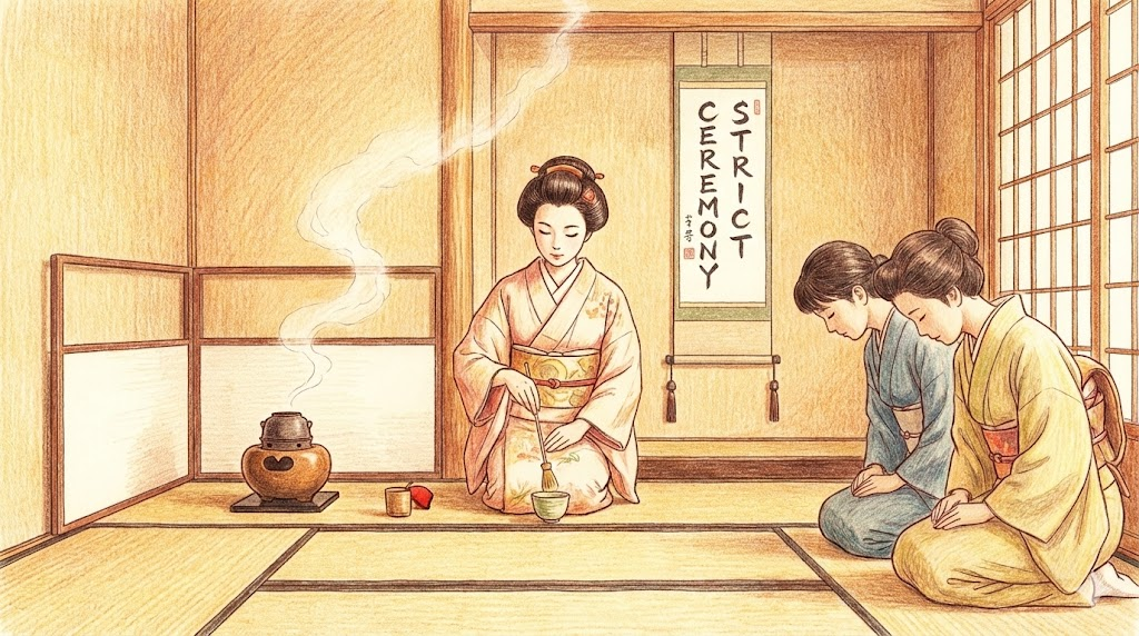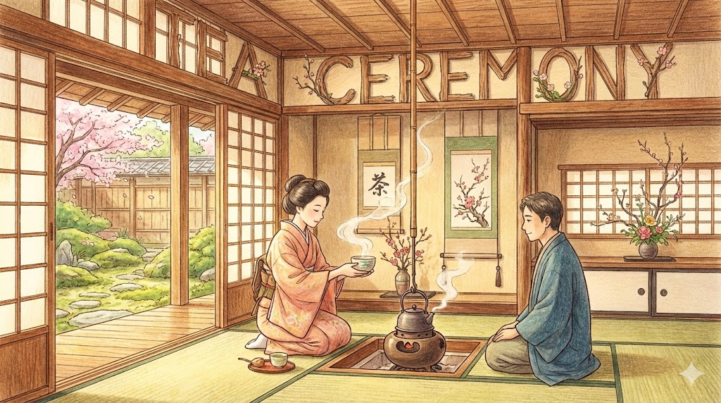 단순히 차를 마시는 것이 아니라, 차를 준비하고 대접하는 과정을 통해 마음을 수양하고 손님에게 정성을 다하는 '전통적이고 예술적인 의식' 을 말합니다. 주로 일본의 '다도(Chanoyu)'를 지칭할 때 많이 쓰이며, 정해진 예법과 절차에 따라 엄숙하고 고요한 분위기에서 진행됩니다.