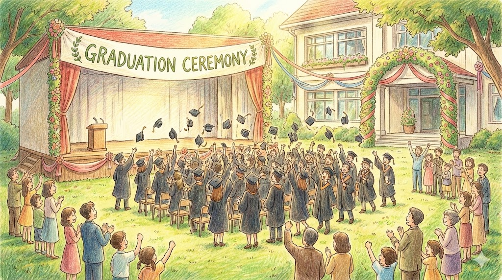 - 해석: 학교 과정을 마치는 것을 기념하는 행사입니다. 미국에서는 'Commencement'라고도 합니다.