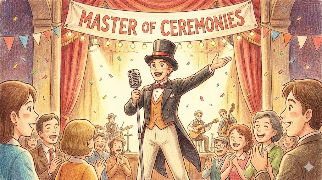 공식 행사, 연회, 파티 등에서 '순서를 진행하고, 연사를 소개하며, 분위기를 띄우는 역할을 하는 사람' 입니다. 우리가 흔히 말하는 'MC' 가 바로 이 단어의 약자(Emcee)입니다. 청중을 지루하지 않게 하고 행사를 매끄럽게 이끌어가는 핵심 인물입니다.