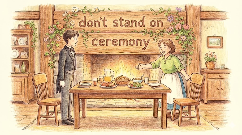 친한 사이나 편안한 자리에서도 굳이 딱딱한 예의범절이나 순서를 따지는 것을 말합니다. 주로 부정문이나 명령문 형태인 "Don't stand on ceremony(어려워하지 마세요, 격식 차리지 마세요)" 로 쓰여, 상대방에게 '집에 있는 것처럼 편하게 지내라' 고 권할 때 가장 많이 사용합니다.