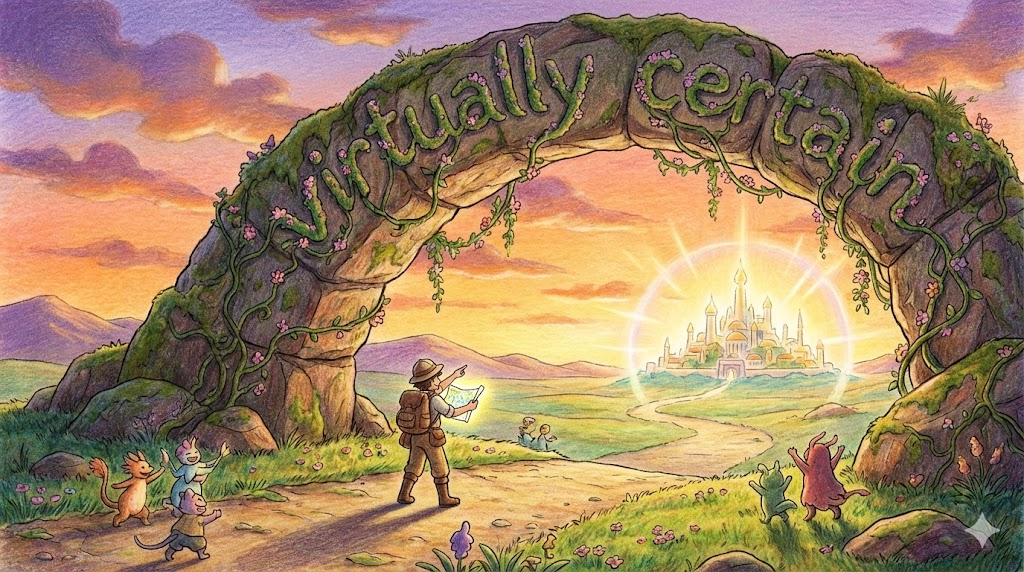 | virtually certain | 거의 확실한 | 명사구, '확률'. | '사실상' '(' 'virtually' ') '의심' '할' '여지' '가' '없는'. |